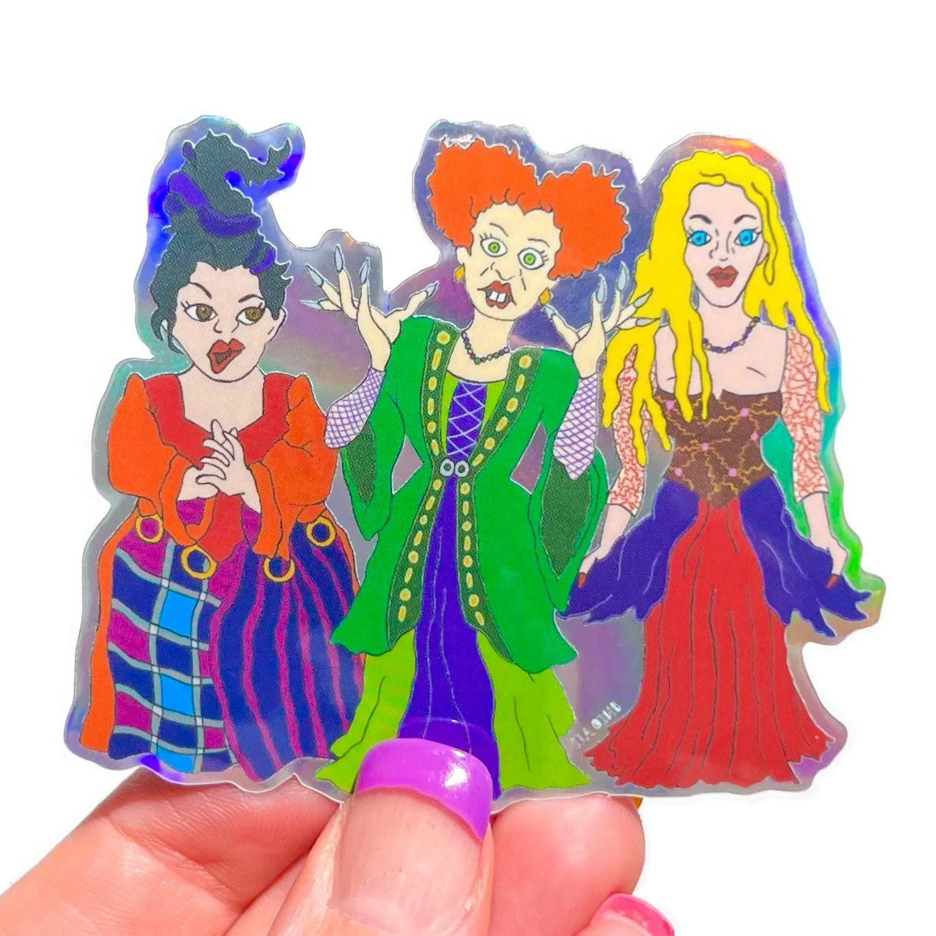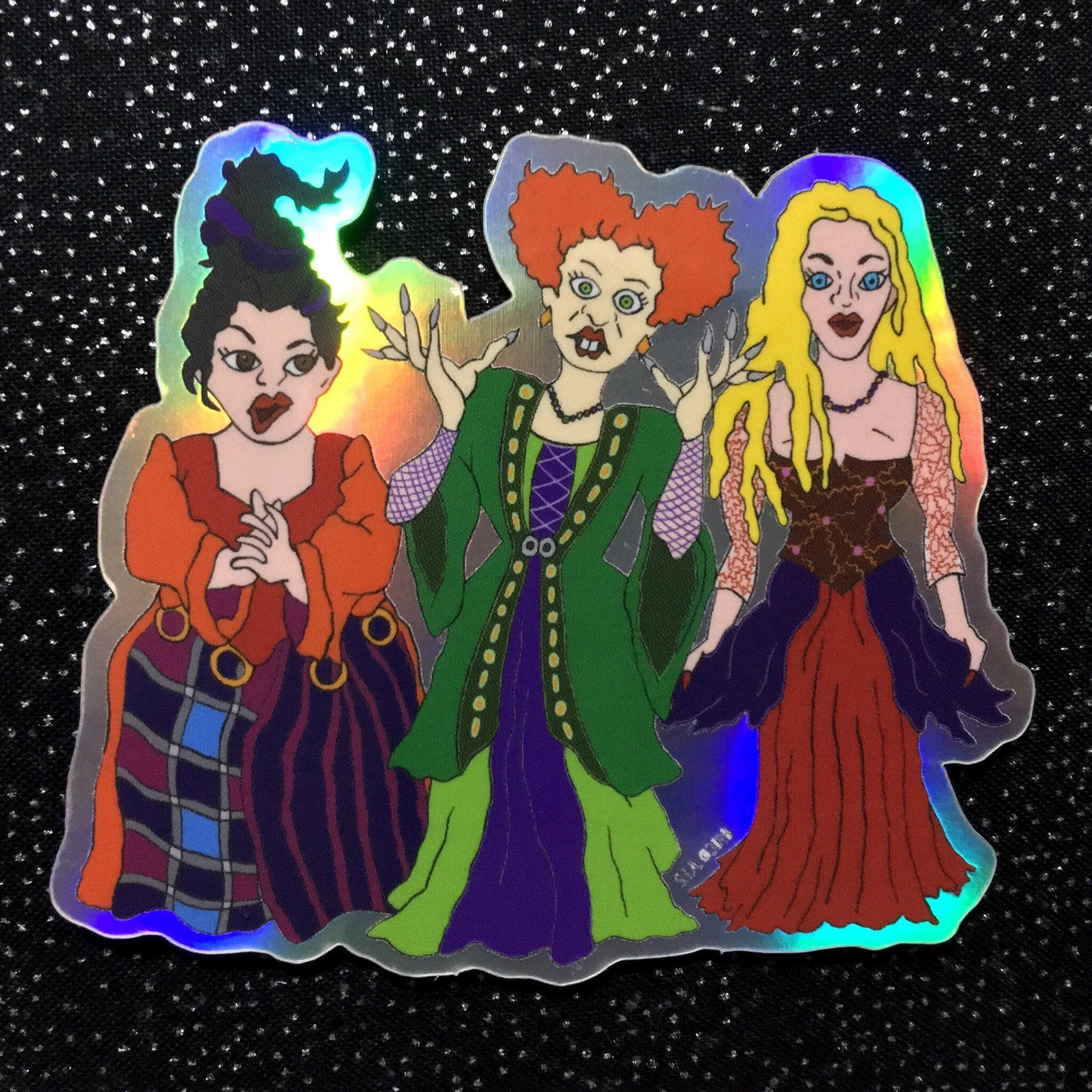 This listing is for one special edition Hocus Pocus sticker, designed by Haley Baker of Surprise Inside Art, and printed on a color-shifting holographic vinyl. This sticker measures 2.75x3 inches, so you can easily see the details of each character’s features and unique outfits. Move this baby around in the light, and it will feel just like Winnie Sanderson is casting a devilish spell on you!