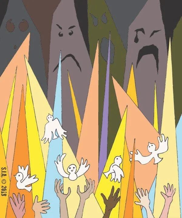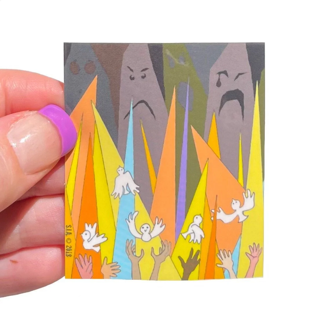 The illustration on this sticker was inspired by the song “Lay Down (Candles in the Rain)” by Melanie. It’s about facing fear with peace and forgiveness. Art by Haley Baker of Surprise Inside Art.